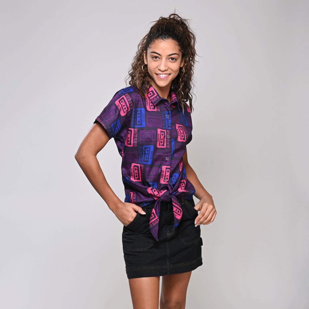 Add a fun feminine touch to your classic button down shirt with a tie front! Customize with your allover design. Digitally printed to allow for full-color, this button down is perfect for the summer. Lightweight, soft-feel fabric. Works great as a fun uniform top or use it for a summer event or giveaway! Made in the USA for quick turn times.